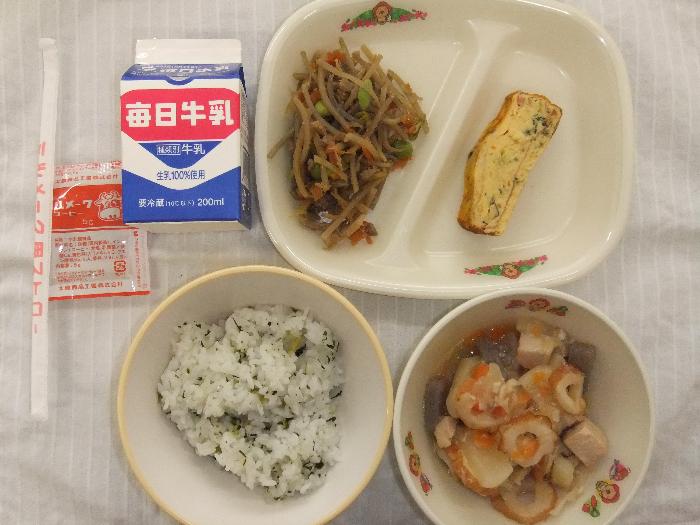 献立 菜めし、牛乳、関東煮、千草焼き(野菜入り卵焼き)、きんぴらごぼう、ミルメークです。