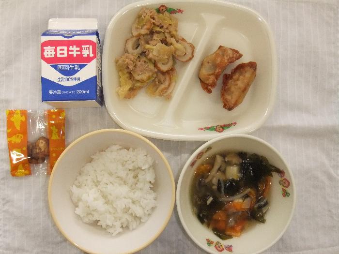 献立 ごはん、牛乳、わかめスープ、揚げぎょうざ、まぐろとキャベツの煮物、黒糖そら豆です。